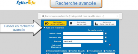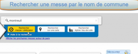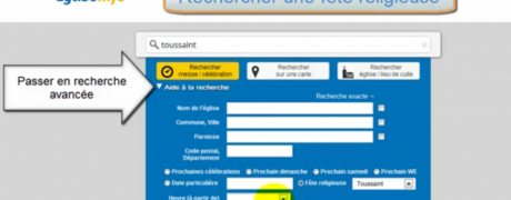 Cette vidéo vous montre comment rechercher l’horaire d’une fête religieuse. Vous avez 2 possibilités de recherche des horaires des messes de fêtes religieuses.Suivez la vidéo et les étapes décrites ci-dessous: 1/ Par recherche avancée Cliquez sur « Aide à la recherche » Cl